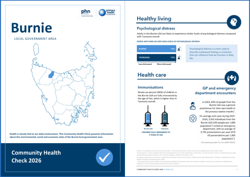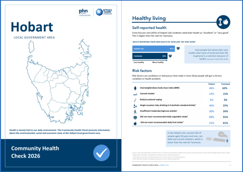 Primary Health Tasmania has released updated ‘community health checks’, providing a detailed snapshot of health and wellbeing across Tasmania’s 29 local government areas.